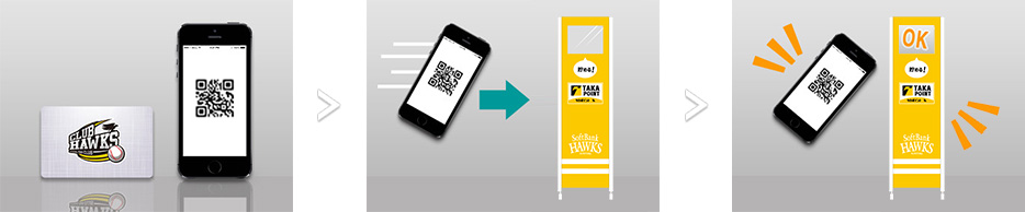 各入場ゲートに設置している来場ポイント端末に、クラブホークス会員証・デジタル会員証をかざしてください。