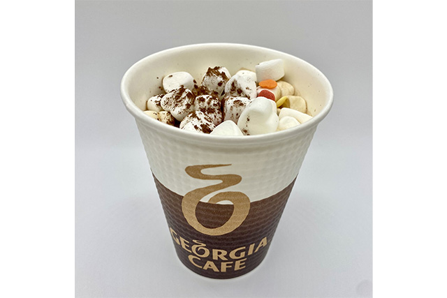 (ホットカフェモカ+チョコレートソースのドリンクに、ハート型マシュマロ・シュガー、ココアパウダーをトッピング)