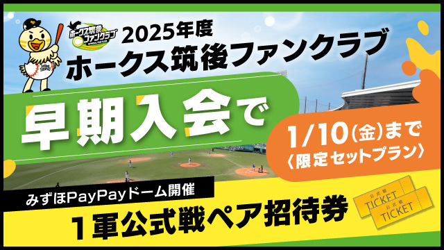 早く入会すればするほど、ポイント山分けやチケットの特典が増える!2025年度ホークス筑後ファンクラブの早期入会キャンペーンをご案内します。