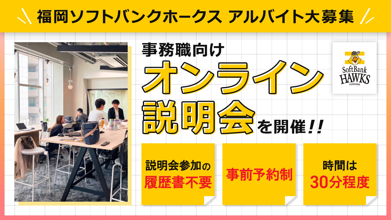 福岡ソフトバンクホークスでは現在、2025年シーズンに向けて様々なアルバイトを募集しております。ホークスの仕事に興味はあるけれど、「実際どんなことをしているのかわからない」、「自分にできるか不安」という方に向けて、事務系職種のオンライン説明会を実施いたします!ぜひ、お気軽にご参加ください!