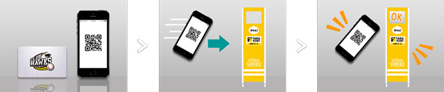 各入場ゲートに設置している来場ポイント端末に、クラブホークス会員証・デジタル会員証をかざしてください。