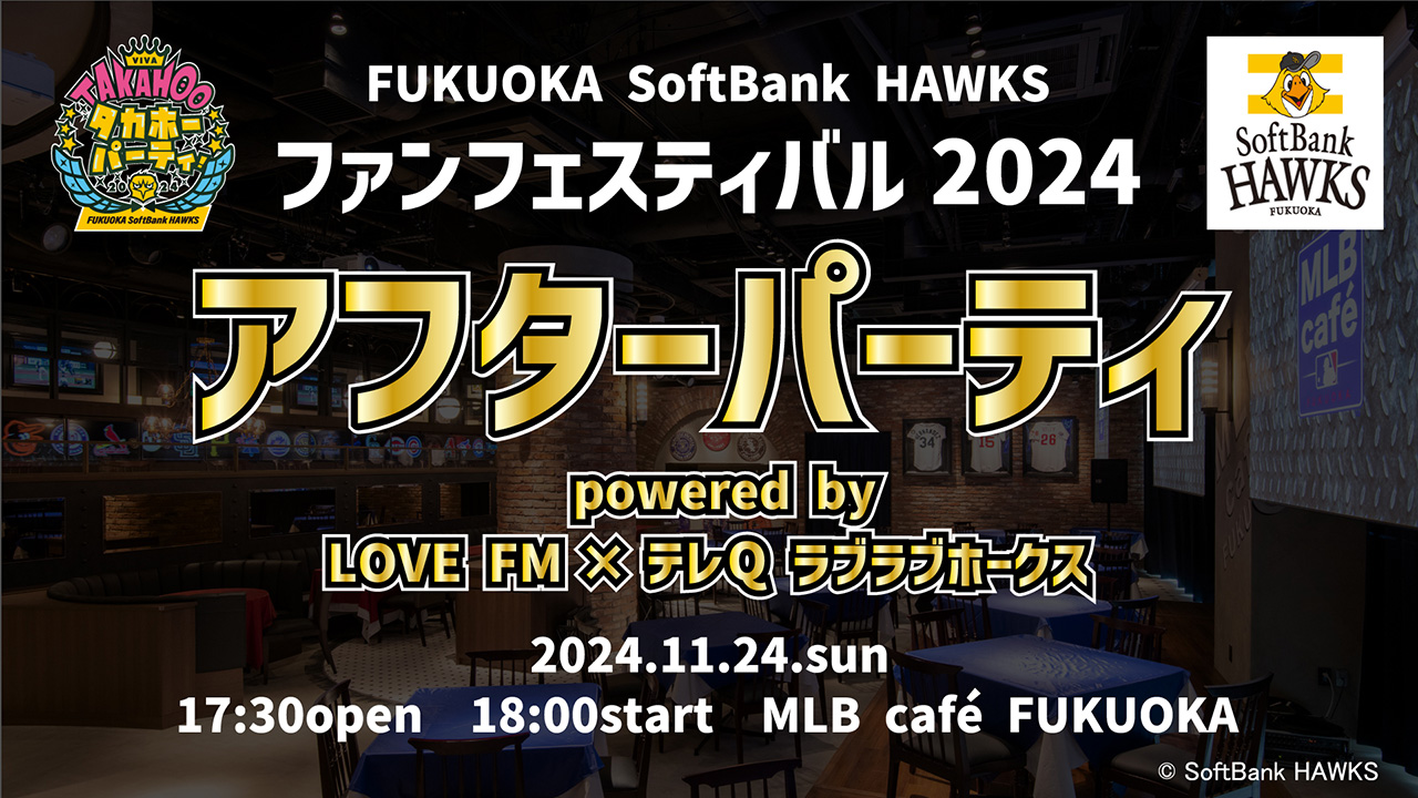 11月24日(日)のファンフェスティバル2024の後は福岡のFMラジオ局「LOVE FM」内の番組「テレQラブラブホークス」とコラボしてアフターパーティをMLB café FUKUOKAにて開催☆♪ホークス選手の乾杯でスタートし、ホークスOB柴原洋さんやTVQのアナウンサーの皆さんと今年のシーズンを振り返ります!さらにホークス選手のサイン入り試合球が当たる抽選会やイベント参加特典には「チームラボフォレスト福岡-SBI証券」の招待券も☆チケットの発売は11月2日(土)10:00~!MLB café FUKUOKAのグルメを召し上がりながらイベントをお楽しみください♪