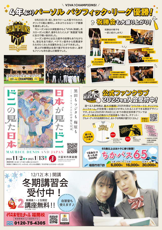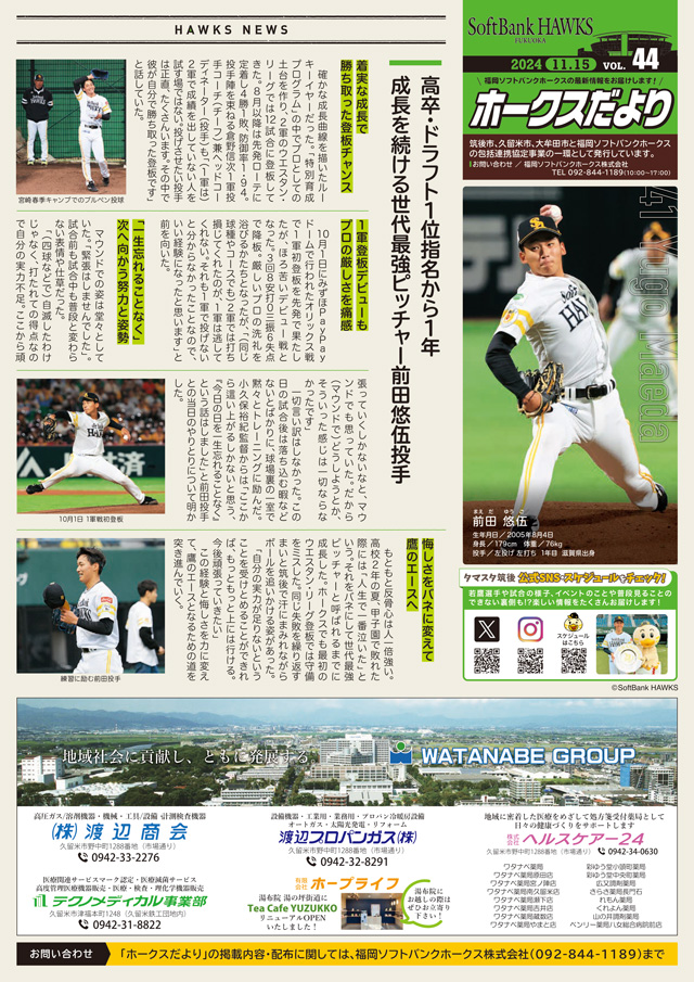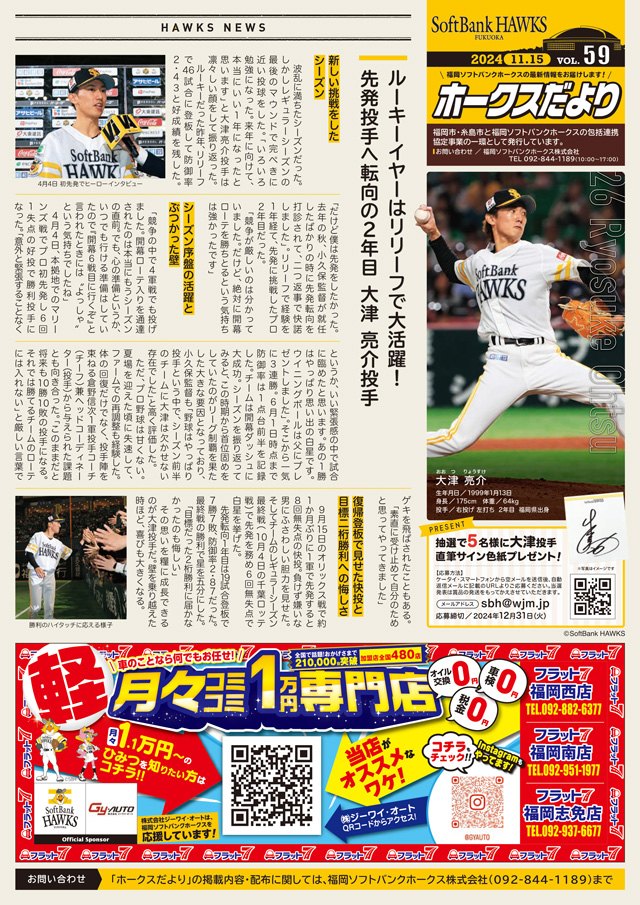 福岡市・糸島市、筑後市・久留米市・大牟田市と福岡ソフトバンクホークスの包括連携協定事業の一環として、『ホークスだより』を発行しています。 11月号の福岡市・糸島市版は大津亮介投手、筑後市・久留米市・大牟田市版は前田悠伍投手を特集した内容でお届けします。