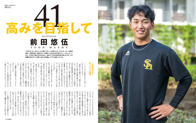 巻頭選手インタビューでは、ルーキーの前田悠伍投手に話を聞きました。1年目ながら1軍デビューを果たした前田悠投手。悔しくも結果を残すことができませんでしたが、そこで得られた課題を明確にし、このオフに取り組むこと、そしてこれからどんな投手になっていきたいのか、たくさん語ってくれています。