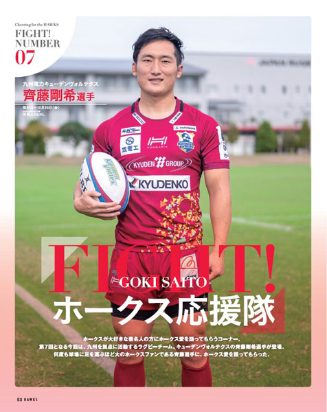 ホークスが大好きな著名人にホークス愛を語っていただく「ホークス応援隊」。第7回となる今回は、九州を拠点に活動するラグビーチーム・九州電力キューデンヴォルテクスの齊藤剛希選手が登場。何度も球場に足を運ぶほど大のホークスファンである齊藤選手に、ホークス愛をたくさん語っていただきました。