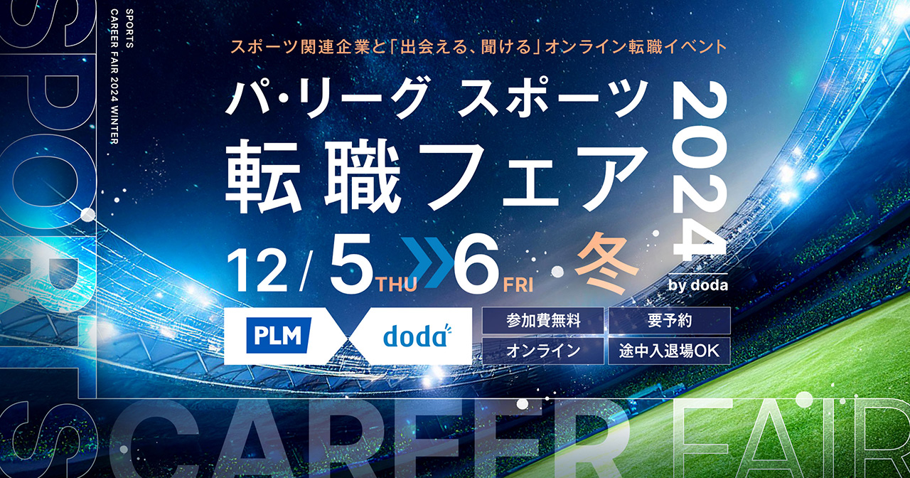 2024年12月5日(木)、6日(金)の2日間「パ・リーグ スポーツ転職フェア2024冬 by doda」をオンライン上で開催します!本イベントは、パ・リーグ6球団をはじめスポーツ関連企業が一堂に会し、転職を考えるビジネスパーソンの方々にビジネスとしてのスポーツをより知っていただくための中途採用イベントで、パーソルキャリア株式会社が運営する転職サービス「doda」のご協力のもと開催いたします。