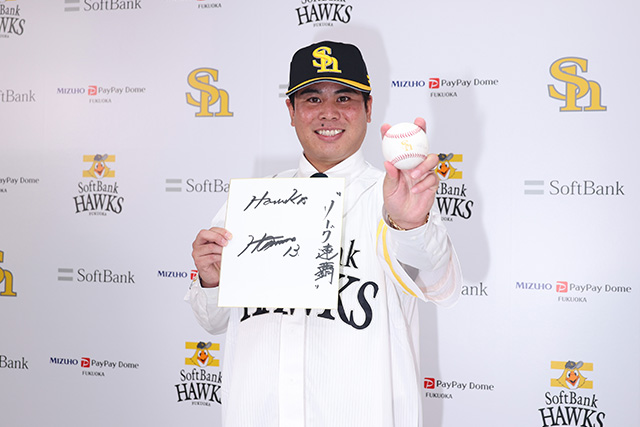 ホークス入団について「移籍先の話を聞いた時は本当にびっくりした」と話し「今までリーグも違って中々、福岡の地で投げるタイミングが無かったが今回九州に戻ってくるにあたり友人や知人も喜んでくれているのでそういった方々の為にもしっかり頑張りたい」と意気込みました。