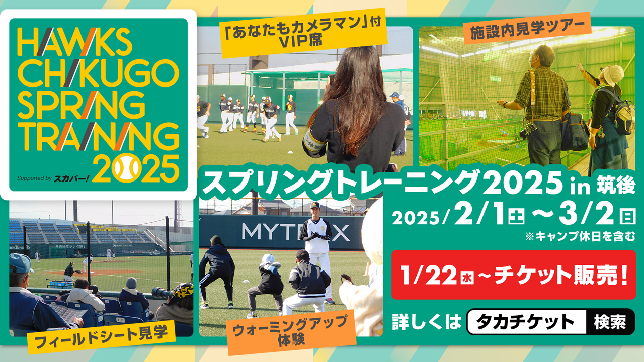HAWKSベースボールパーク筑後では、2月1日(土)~3月2日(日)の期間※、「福岡ソフトバンクホークス スプリングトレーニング2025 in 筑後 supported by スカパー!」を実施します。※キャンプ休日を含む