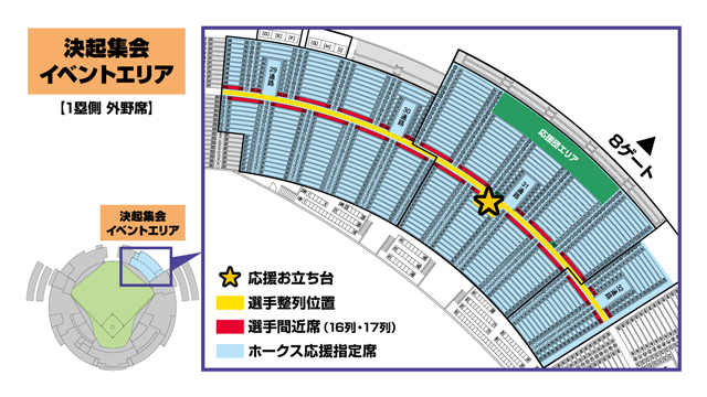 決起集会でホークス選手が登場する「ホークス応援指定席(1塁側外野エリア)」および、その中でもより選手を近くで見ることができる「選手間近席」のチケットを1月25日(土)10:00より販売!皆様のご参加お待ちしております。
