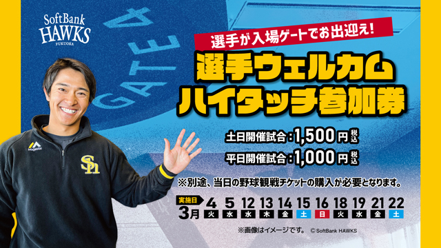 みずほPayPayドーム開催のオープン戦全11日程では、各対象ゲートに選手1名が登場し、ファンの皆さまをお出迎えするウェルカムグリーティングを実施します♪