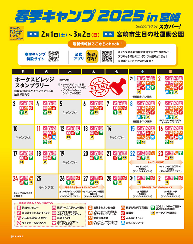2月1日(土)から宮崎で行われる「福岡ソフトバンクホークス 春季キャンプ2025 in 宮崎 Supported by スカパー!」と筑後で行われる「福岡ソフトバンクホークス スプリングトレーニング2025 in 筑後 Supported by スカパー!」。イベント情報など最新情報をお届け。春季キャンプ前にしっかりチェックしよう!