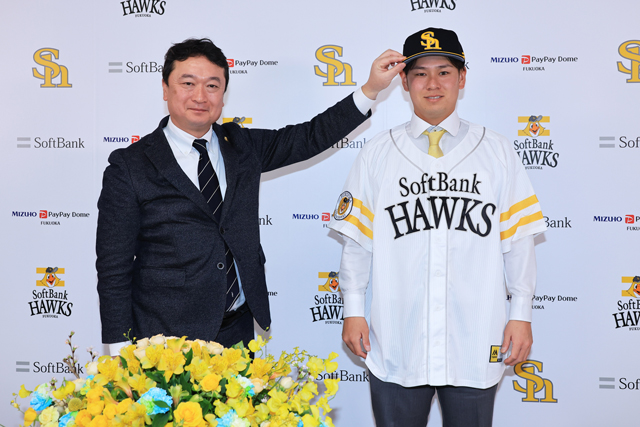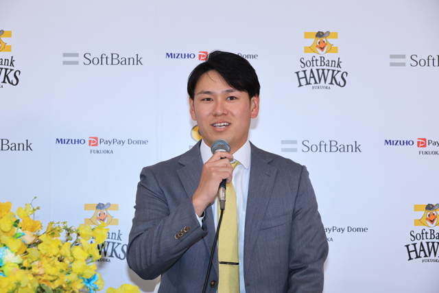 ホークスの印象は「毎年のように優勝争いをしている常に強いチーム、誰かがケガをしても穴を埋められる選手がいる」と話し「1番自信のあるストレート、次にカットボール。この変化球で去年自信を持って投げることができたのでこれを生かし新たな武器を身に着けて1年間戦えるピッチャーになっていきたい」と意気込みを語りました。