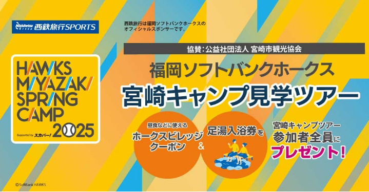 西鉄旅行株式会社では、「福岡ソフトバンクホークス宮崎春季キャンプ2025 Supported by スカパー」見学バスツアーが好評発売中です。