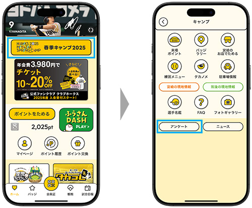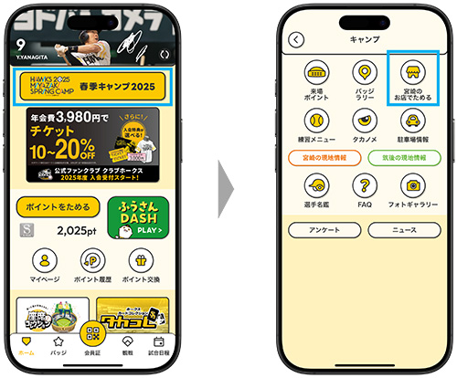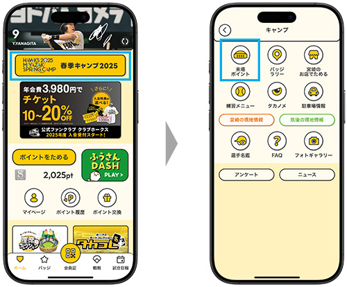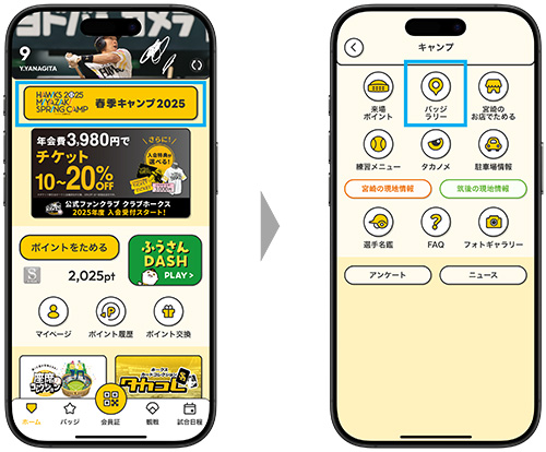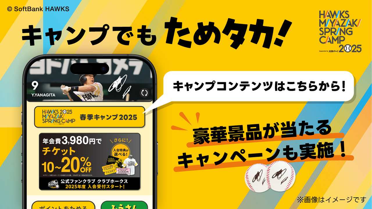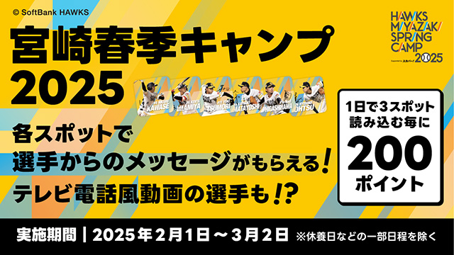 ホークス公式アプリ「ためタカ!」に1月24日(金)からホークス 春季キャンプ2025 in 宮崎 Supported by スカパー!とホークス スプリングトレーニング2025 in 筑後 Supported by スカパー!のコンテンツが登場!選手の練習場所がわかる「タカノメ」など、キャンプ見学を満喫するための機能が盛りだくさん。さらに、今年は「バッジラリー」で選手の限定メッセージがもらえる!来場ポイントもアプリから♪(※一部機能は宮崎のみ実施)
