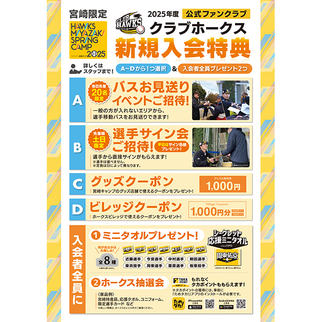 宮崎キャンプ期間中、入会受付特設ブースにて公式ファンクラブ「クラブホークス」の新規入会受付を行います。