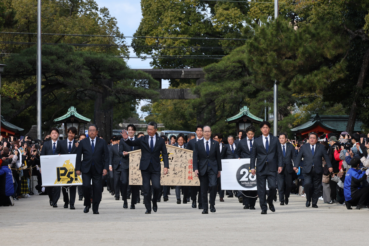 小久保裕紀監督、王貞治球団会長、城島健司チーフベースボールオフィサーらを先頭に、球団理念である「めざせ世界一!」と書かれた巨大絵馬を周東佑京選手会長と栗原陵矢選手が、今季スローガンの『PS!(ピース)』『ソフトバンクホークス誕生20周年ロゴ』が描かれたフラッグを柳町達選手と松本裕樹投手が手にして続き、大勢の選手、首脳陣、球団フロント、スタッフらが多くのファンの声援を受けながら参道を進みました。