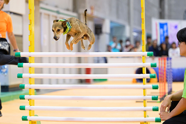 訓練されたワンちゃんたちが飼い主さんと様々なフォーメーションを展開するチームパフォーマンス競技「カドリール」や、高いハードルを飛び越える技を披露します。