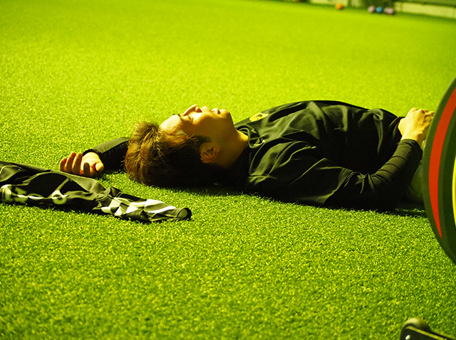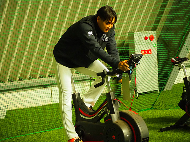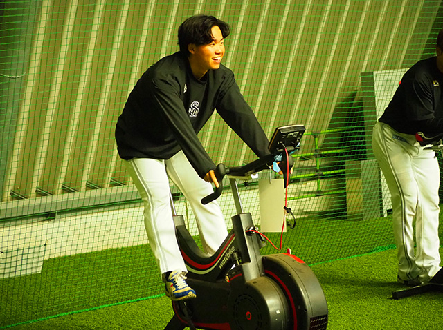 今度は投手陣がバイクを漕いでいました。それぞれが自分自身の限界に挑戦しているため、終えると倒れ込み、脚がプルプルして生まれたての小鹿のようになっていました。