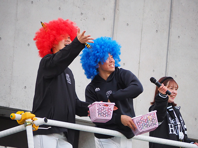 同じく、節分企画で若鷹による豆まきも行われました。村上泰斗投手と安德駿投手が登場。まずは皆さんに自己紹介から。ところが、安德投手がまさかの失策。「背番号20の安德駿です。……あ、28の!!!」。自分の背番号を言い間違えるという失態に一同爆笑でした(笑)。隣にいた村上投手も、しっかり突っ込んでいましたね。