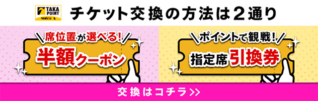 貯まったポイントはチケットへの交換がオススメ!「招待券(引換券)」は800pt~、席位置が選べてチケット代金が半額になる「半額クーポン」は500ptというお手頃なポイント数で利用できます☆