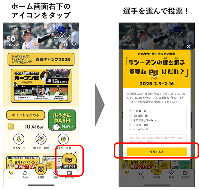 - ※投票時にクラブホークス・タカポイント会員としてログインしていない方は抽選の対象外となります。ログインをご確認の上、ご投票ください。
