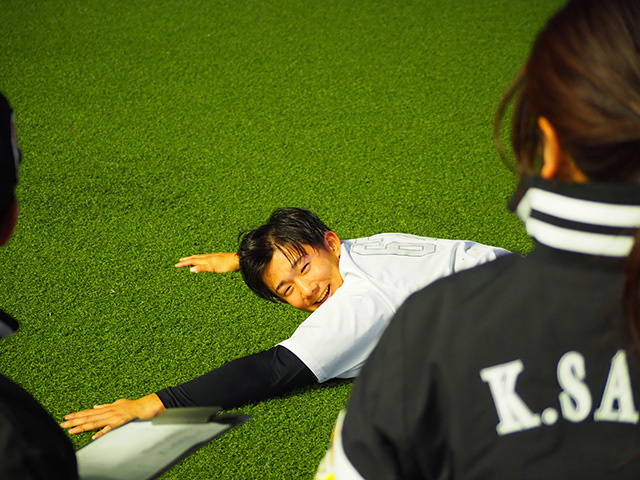 また、切り返しテストでイヒネ選手に続く2位だったのがルーキーの石見颯真選手。転倒してしまいましたが、身体のキレ味を発揮しました。