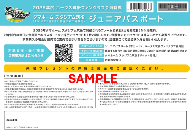 - ホークス筑後ファンクラブにご入会いただいた2010年4月2日以降生まれの方