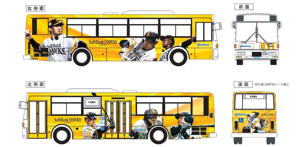 ホークスの選手たちがデザインされた2025年シーズン特別デザインの西鉄ラッピングバスが2月23日(日)より運行します!福岡市内を駆け巡る特別仕様のバスを見つけてみてください!