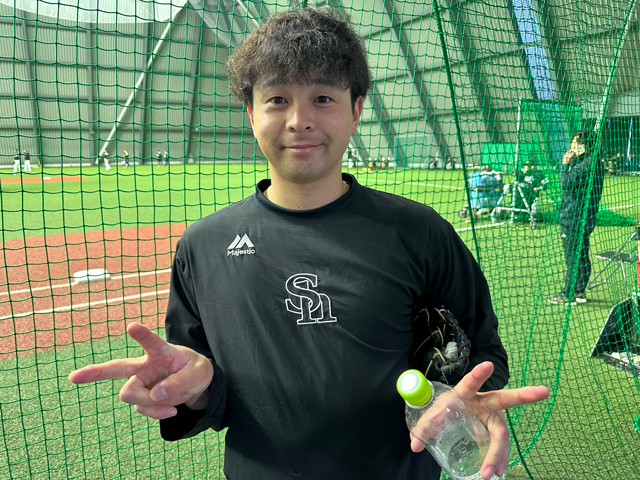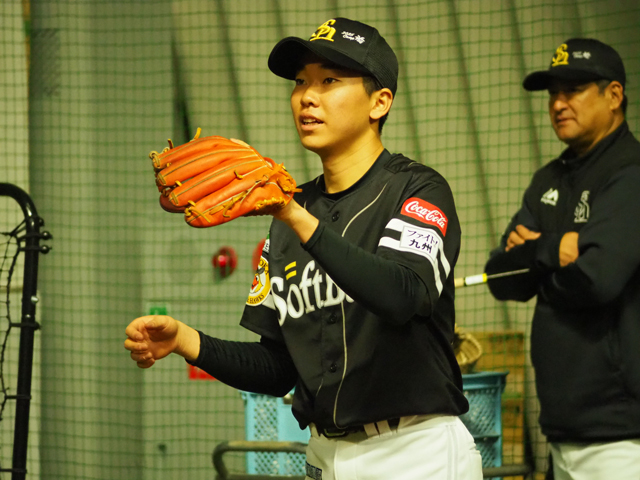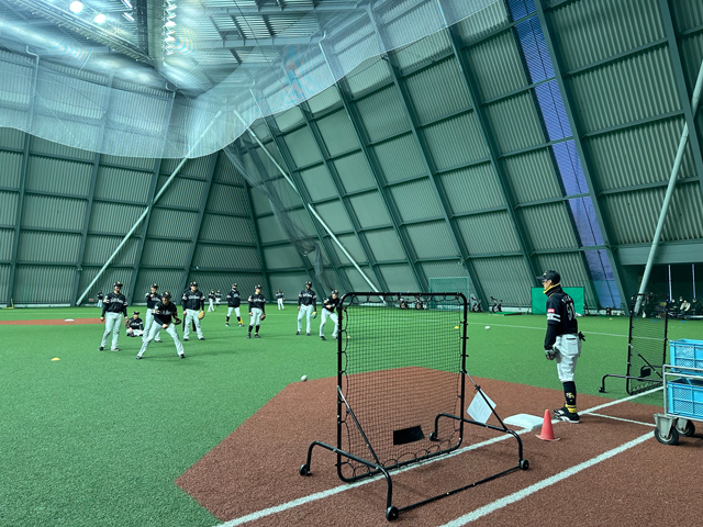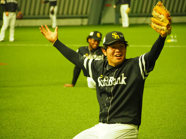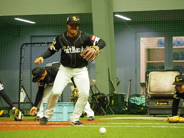 今年は特に守備練習に多く取り組んでいる佐倉選手。「守備ができないと試合に出られないと実感したので、キャンプ中から守備多めに取り組もうと思っています」とうなずきます。パンチ力が持ち味ですが、その打力を生かすためにも、守備での安定感を求めて汗を流していました。