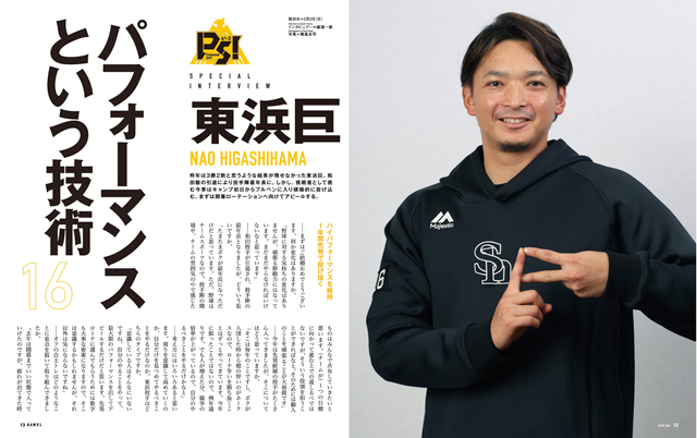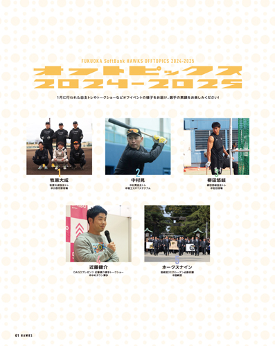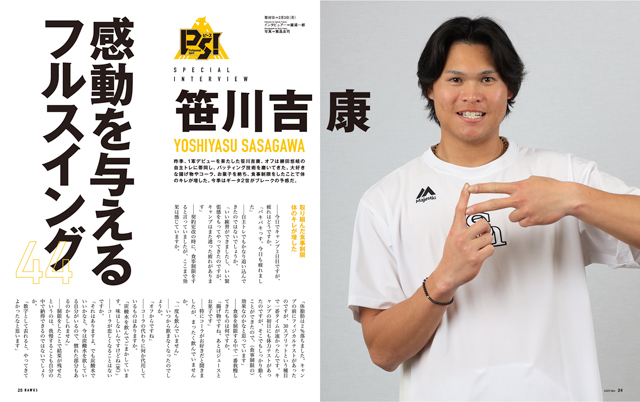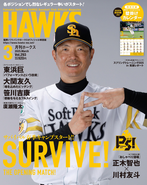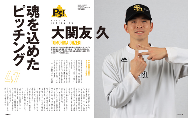 巻頭インタビューでは投手を代表して東浜巨投手にインタビュー。昨年は悔しい思いをした東浜投手。今シーズンにかける思いをたくさん語ってくれています。また先発ローテーションが内定している大関友久投手にもインタビューを行いました。昨年はキャリアハイの8勝を挙げた大関投手。今季は13勝以上、160イニング以上という目標を設定。さらなる進化を求め今季へ挑みます。さらに、昨年1軍デビューを果たした笹川吉康選手にもインタビュー。自主トレの師匠でもある柳田悠岐選手も成長を認める笹川選手。今シーズン、大ブレークの予感です!