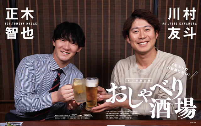 オフ大人気企画「おしゃべり酒場」の第二弾に登場したのは、正木智也選手と川村友斗選手。同級生でプライベートでも仲の良い2人。美味しいご飯とお酒を楽しみ、野球の話からプライベートなトークまで、たくさん語ってくれています。