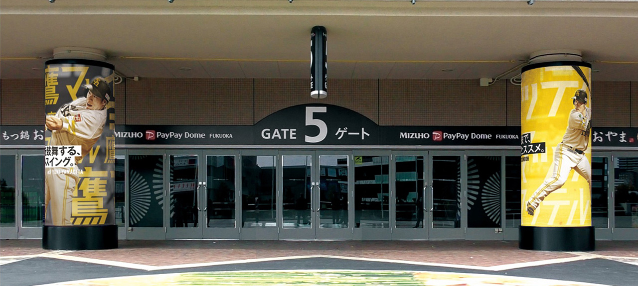 球場外周デッキの全入場ゲート(※7ゲートを除く、計14箇所)に設置された円柱型のLEDビジョンで、選手映像のほか、「開幕戦」、「ピンクフルデー」、「鷹祭 SUMMER BOOST」などのイベント開催時には、イベントと連動した演出を展開することで、ご来場の皆さまが入場前から楽しめる映像コンテンツを提供します。