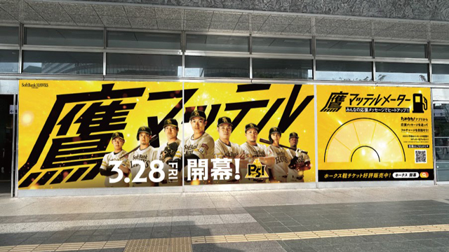 博多駅ガラス面に巨大メーター「鷹マッテルメーター」が出現!ホークス公式アプリ「ためタカ!」から、あなたが開幕スタメンだと考える「いま最も鷹マッテル」選手を予想して、応援メッセージとともに投稿すると、その数に連動してメーターの針が進みます。メーターがMAXになると、この装飾に何かが起こる・・・?