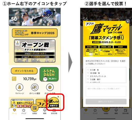 「ためタカ!」アプリにクラブホークス・タカポイント会員としてログインした上で投票後、下記応募フォームよりご応募ください。
