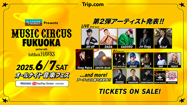 2025年6月7日(土)開催!音楽を中心に、ファッション、グルメ、スポーツなど様々なコンテンツが楽しめるオールナイト音楽フェスティバル「STONE MARKET Presents MUSIC CIRCUS FUKUOKA partner with SoftBank HAWKS」のプレリクエスト先行販売が、ローソンチケットで開始されます。一般発売に先駆けてチケットを購入できるこのチャンスをお見逃しなく!