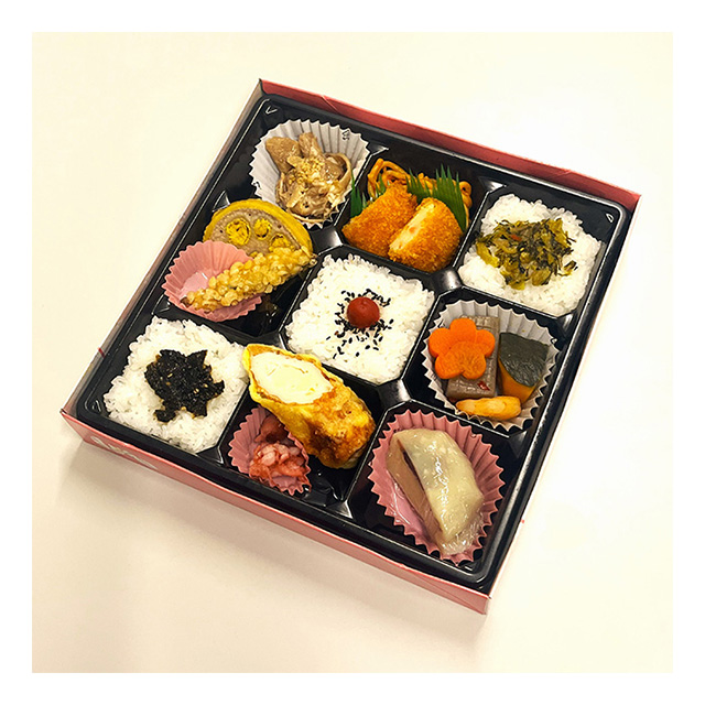 | 内容 | 焼肉・スパゲッティナポリタン・ミニコロッケ・からし蓮根・昆布巻き・きびなごの唐揚げ・煮物(南瓜・こんにゃく・花人参・えび)・ちくわサラダ・タコ・いきなり団子・白飯(海苔の佃煮・梅ごま・高菜) |