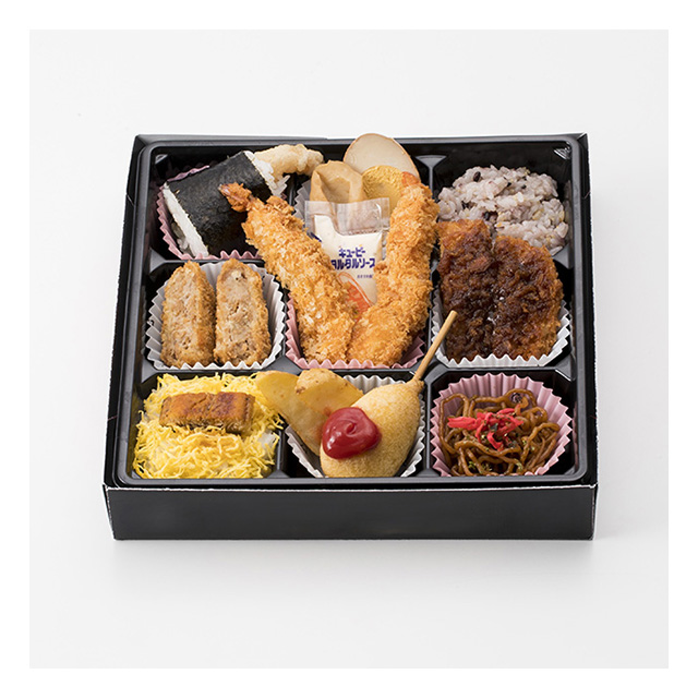 | 内容 | 天むす・みそおでん(ちくわ・大根・玉子)・メンチカツ・海老フライ・味噌カツ・ポテト・ミニドッグ・焼きそば・白飯(うなぎ・錦糸)・十六穀米 |