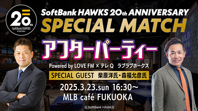 試合後はBOSS E・ZO FUKUOKA 3F MLB café FUKUOKAに集合!福岡のFMラジオ局「LOVE FM」内の番組「テレQラブラブホークス」とコラボしてファンミーティングを開催☆♪ホークスOB柴原洋さん、森福允彦さんによるトークショーを開催します!グルメを召し上がりながらイベントをお楽しみください♪