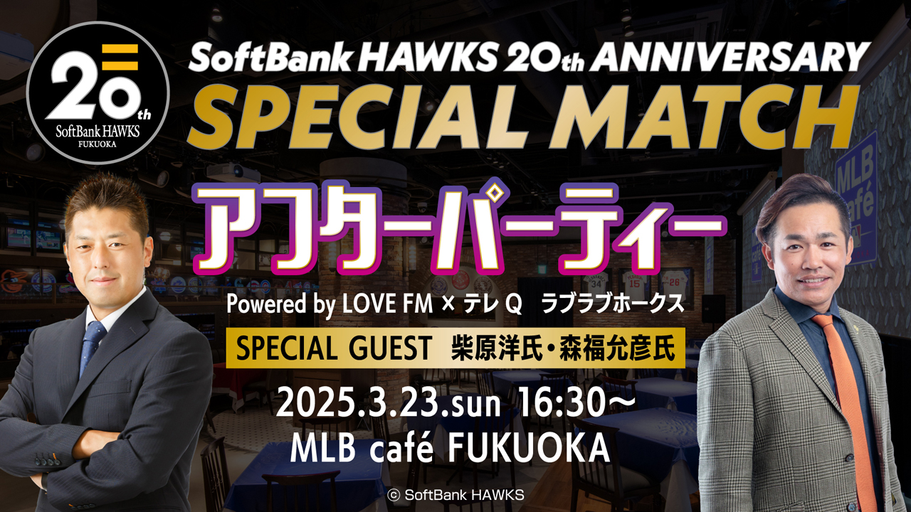 3月23日(日)の「SoftBank HAWKS 20th ANNIVERSARY SPECIAL MATCH」の後は福岡のFMラジオ局「LOVE FM」内の番組「テレQラブラブホークス」とコラボしてファンミーティングをMLB café FUKUOKA にて開催♪ホークスOB柴原洋さん、森福允彦さんによるトークショーを開催します!OB戦の裏話が聞けちゃうかも!豪華景品が当たる抽選会も☆MLB café FUKUOKAのグルメを召し上がりながらイベントをお楽しみください♪