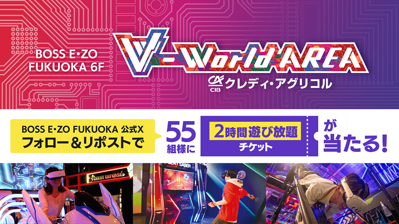 3月23日(日)限定で、BOSS E・ZO FUKUOKA公式Xをフォロー&対象の投稿をリポストした方の中から抽選で、55組(1組4名様)に「V-World AREA クレディ・アグリコル2時間遊び放題チケット」をプレゼントします。