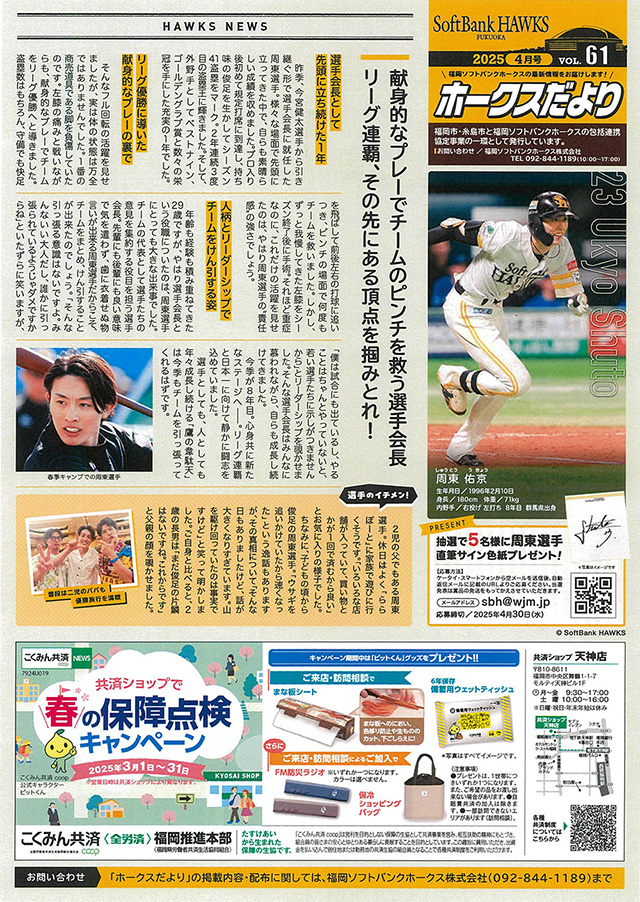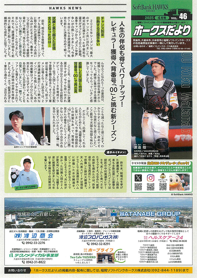 4月号の福岡市・糸島市版は周東佑京選手、筑後市・久留米市・大牟田市版は渡邊陸選手を特集、さらに今回から選手のいつもと違う一面も紹介した内容もお届けします。