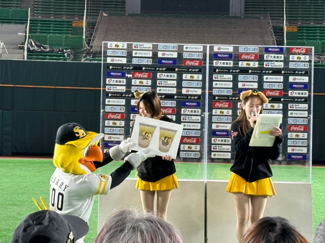 まずはハニーズをハリーホークがお出迎え!セレモニーでは、ハニーズが今季の推し商品・推しグルメを紹介し、グッズを着用してワンワンダンスを披露しましたよ!