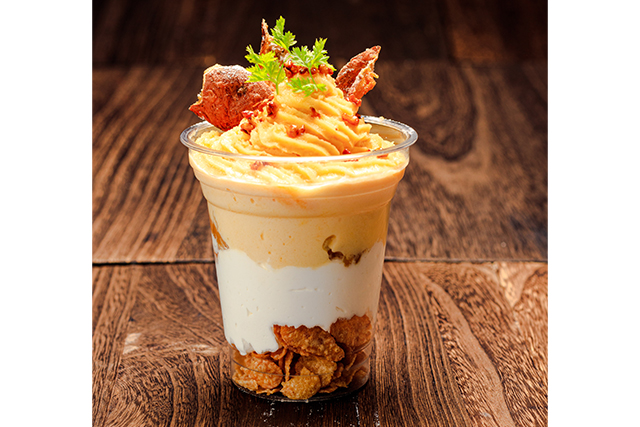 「近藤選手の安納芋プリンパフェ」は、安納芋ペーストを使った濃厚なクリームをたっぷりのせたプリンパフェです。見た目通りしっかり中身が詰まっており、お腹も満たされます♪