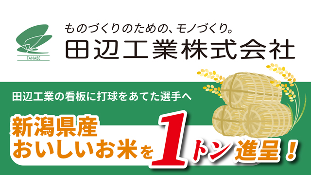 これにより、みずほPayPayドームの主催公式戦において、両チームの選手が田辺工業株式会社の広告にダイレクトで打球を当てた場合、田辺工業株式会社より選手へ「田辺工業賞」として、新潟県産の美味しいお米1tを贈呈いたします。