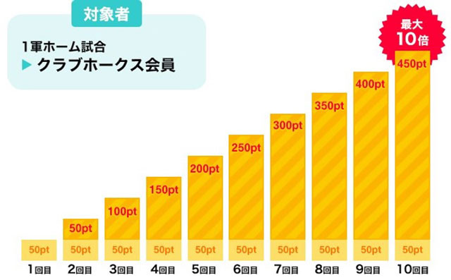また、クラブホークス会員は、1軍ホーム試合への来場2〜10回目で、「タカポイント50pt×来場回数」を加算します!