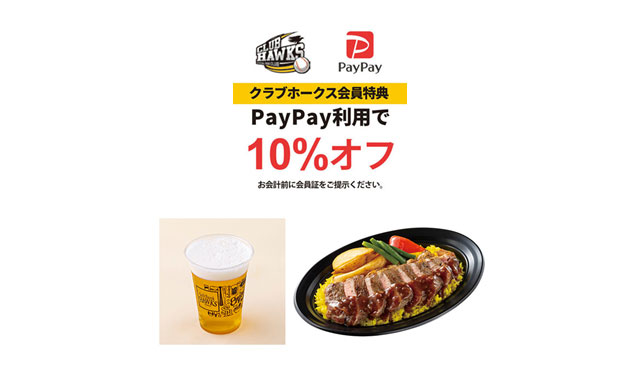 会員証を提示して、みずほPayPayドーム内のグルメ・ドリンクをPayPayでお支払いすると、10%オフになります!