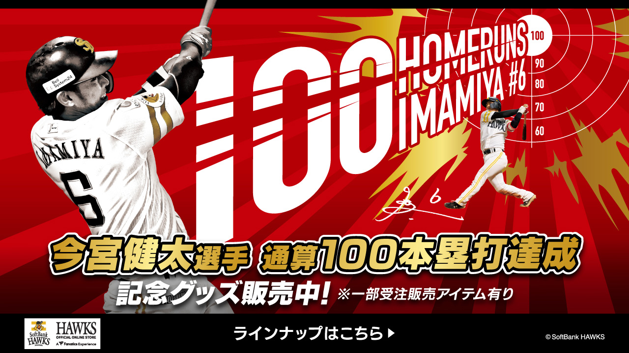 HAWKS STORE各店とHAWKS公式オンライストアでは、今宮選手通算100本塁打達成記念グッズを含む、10,000円(税込)以上をご購入の方の中から抽選で1人に、直筆サイン入りの達成記念パネルが当たるキャンペーンを実施します!