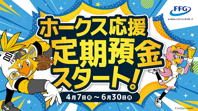 ふくおかフィナンシャルグループ(福岡銀行・熊本銀行・十八親和銀行)は、4月7日(月)から「ホークス応援定期預金」の取り扱いを開始します!2025年のホークスの戦績(日本シリーズ優勝からパ・リーグ3位まで)に応じて金利上乗せや、ホークスの選手と触れ合える体験付きの「ファイト!九州デー観戦ペアチケット」など抽選でプレゼント!