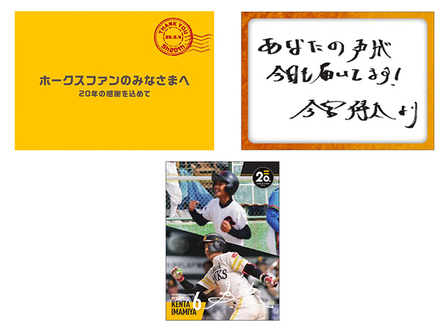表面はホークス選手の少年時代と現在の写真が並び、裏面には選手直筆のメッセージが書かれています。ぜひ、選手の思いを受け取ってください!