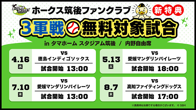 「ホークス筑後ファンクラブ」では、2025年度の新たな会員特典として3軍戦の指定試合が無料で観戦いただけます!この機会にぜひ、選手たちの熱い戦いを間近で応援してみませんか?タマホーム スタジアム筑後で皆様のご来場をお待ちしております!